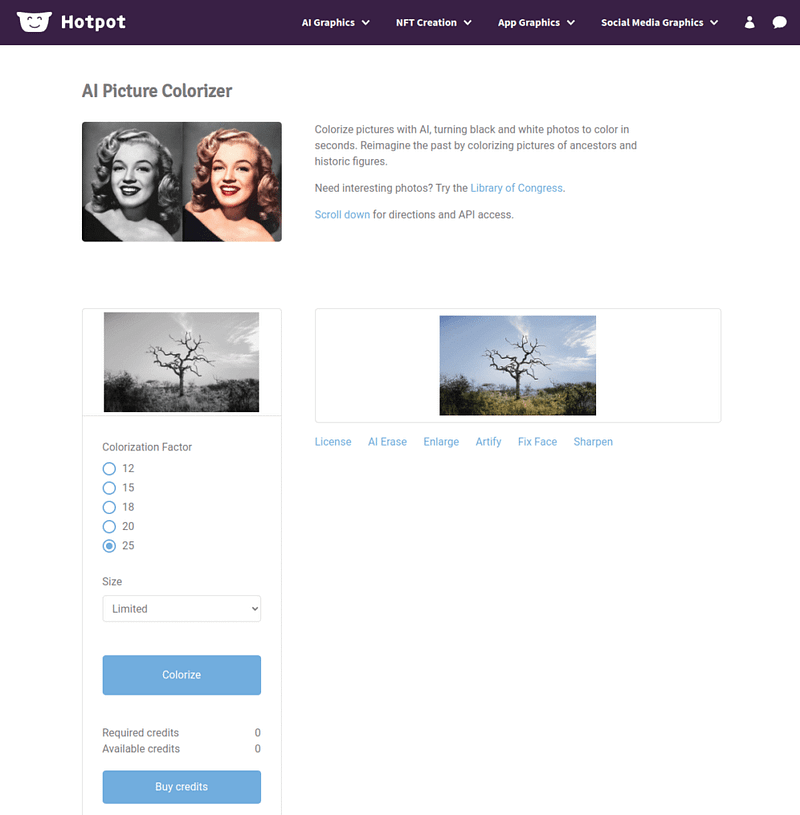 You can use Hotpot for free for personal use. If you want to use the image colorizer for commercial purposes, you need to buy credits: