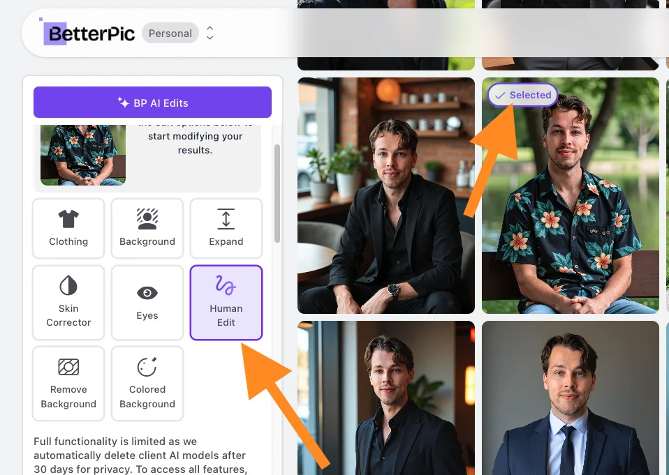 To do this, pick an image and click on “BP AI Edit.” Then choose “Human Edit” on the left-hand side.