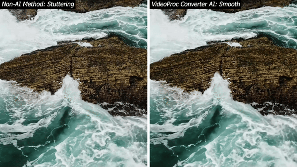 In the above comparison, the left-hand side video has a low framerate. This is a slow motion of a wave hitting the rock and this is typically what happens—especially with older footage.