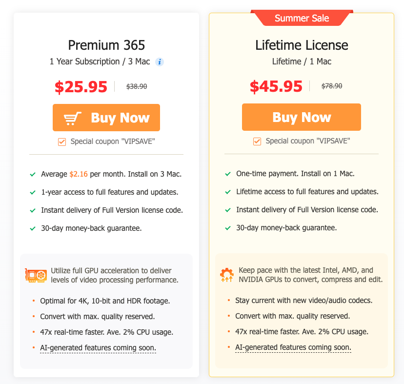 • Lifetime License: $45.95 for 1 Mac, offering lifetime access, latest GPU compatibility, high-quality conversion, and future AI features, along with a 30-day money-back guarantee.
