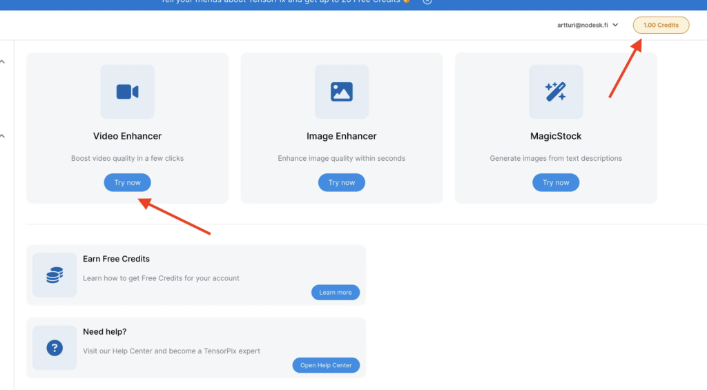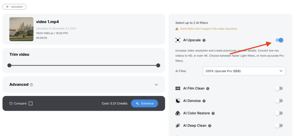 You can try the 2x upscaler for free! But be prepared: It’s just going to upscale the video but not necessarily enhance the quality or remove noise etc.