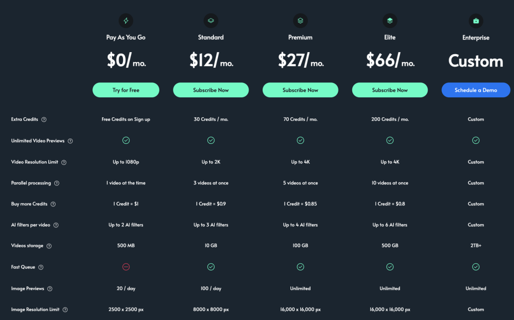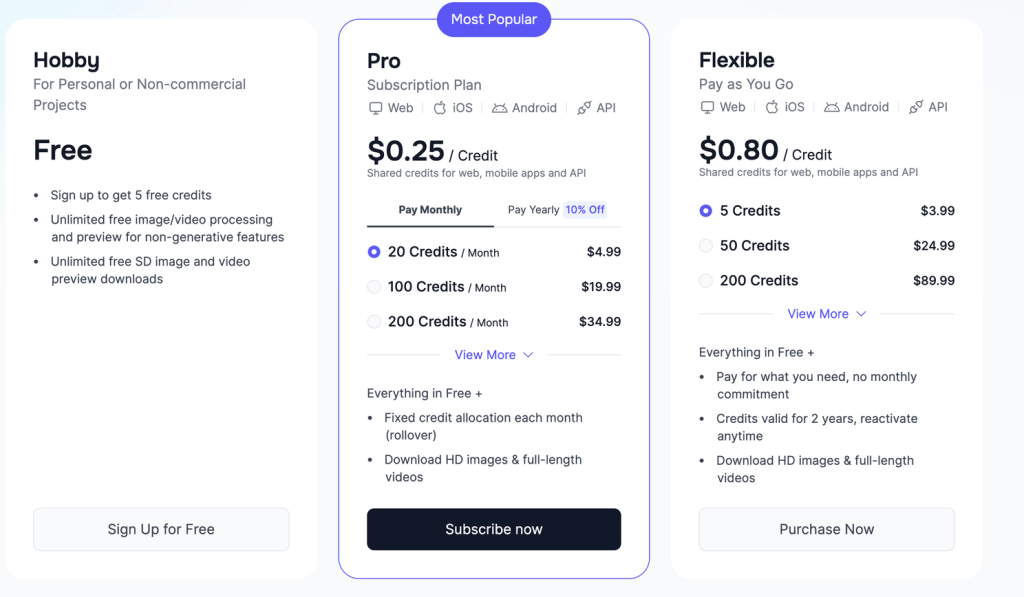 • Hobby (Free): 5 free credits, unlimited SD image/video processing and downloads.