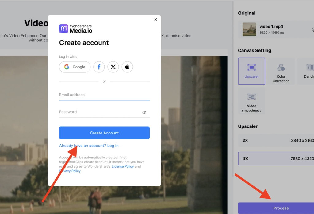 You can find the “Process” button below the video at the bottom of the screen. Make sure to select the “Upscaler” feature first, though.