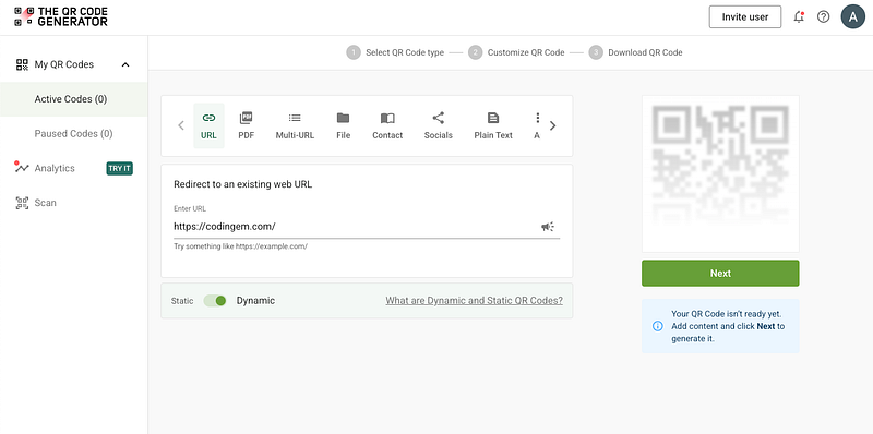 To save your QR codes and track analytics, you need to sign up. Once you do, you’ll get access to your QR code dashboard.