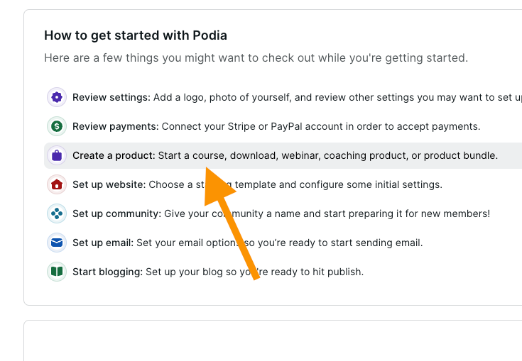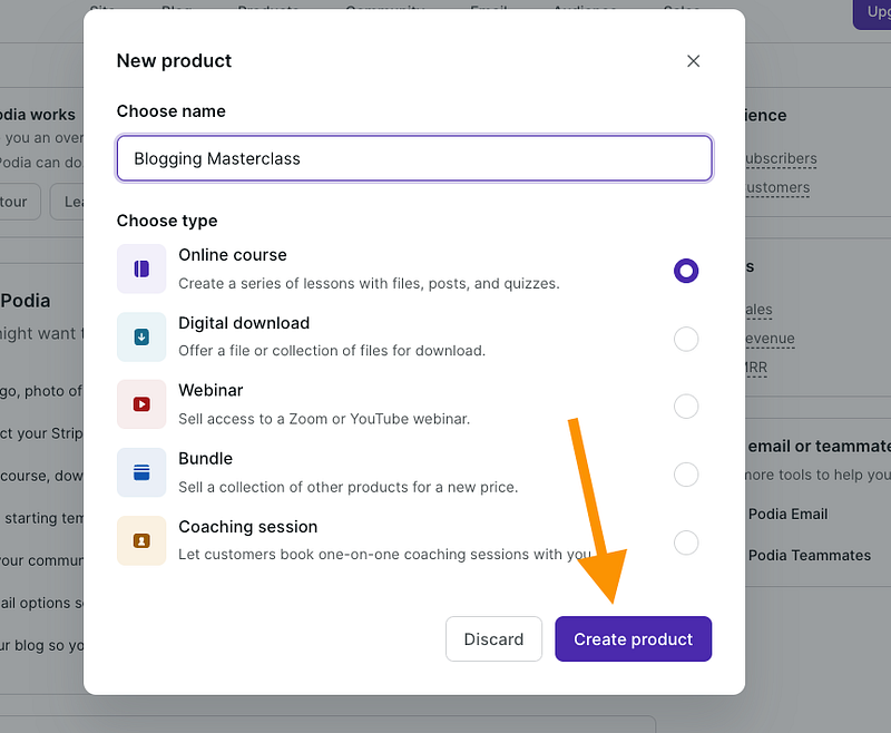 To start a course, just click on the “Create a product” section. (As you can see, there are plenty of other options to pick from too.)
